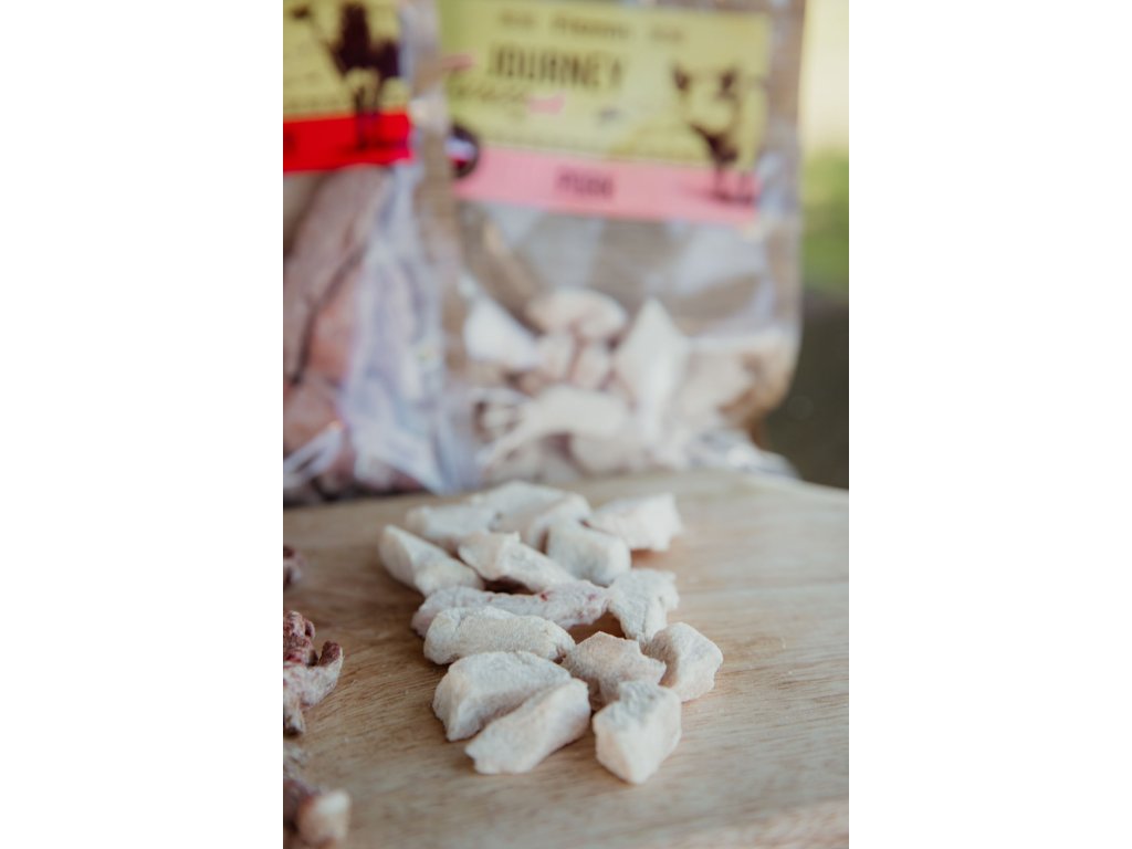 Сочни, ароматни филета от 100% свинско месо — парченца, които изпълват купичката с аромат и привличат вниманието още от първото подушване. Щадящото сушене чрез замразяване запазва естествения вкус, аромат и структура на месото, така че мотивацията идва сама. Свинското е богато на пълноценни протеини и естествен източник на витамин B1; монопротеиновият състав без зърнени култури, оцветители и консерванти е подходящ и за по-чувствителни любимци. А тъй като са филета, а не кубчета, лесно се чупят, не се ронят и удобно се носят в джоб по време на тренировка. Обработено и ръчно опаковано в Чехия, в подножието на Орлицките планини.