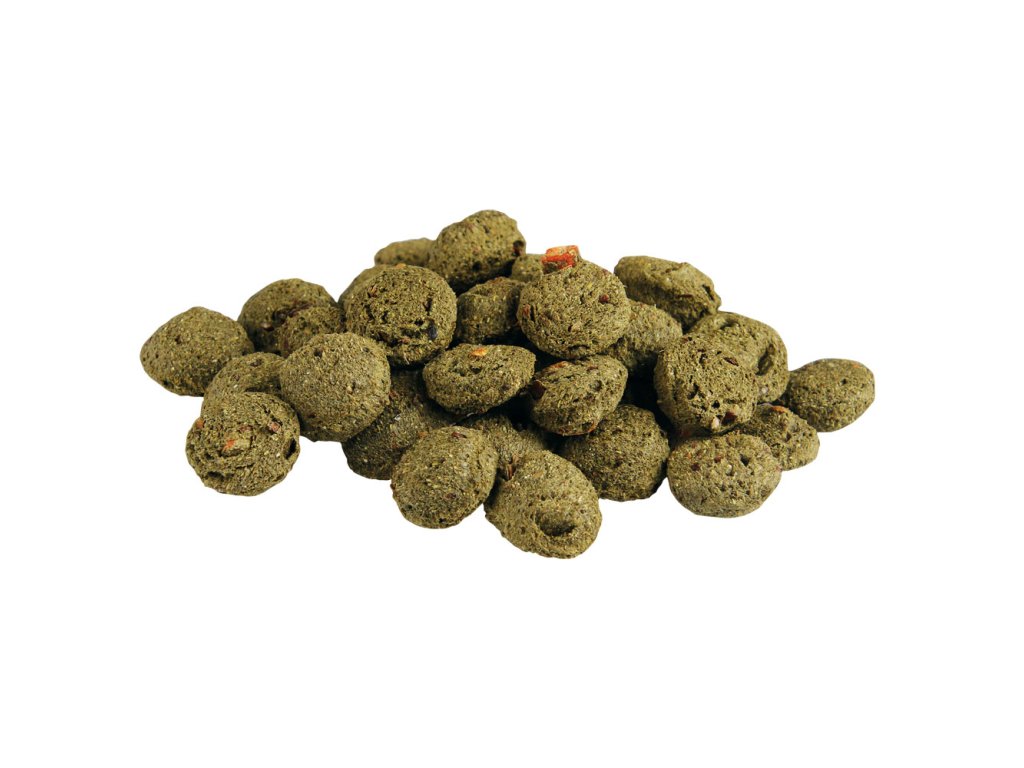 ечемик, пулпа от люцерна, пшеница, пшенични трици, ябълково пюре 40g/kg, ленено семе 20g/kg, сушени моркови, соево масло, сушена билкова смес 7500 mg/kg (шипка 2500 mg/kg, розмарин 2500 mg/kg), сусамово семе, инактивирани дрожди Saccharomyces cerevisiae 900 mg/kg, сушени водорасли Schizochytrium limacinum 100 mg/kg.