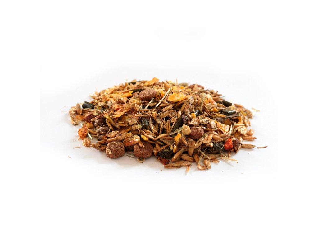 царевични люспи, ечемик, пшенични трици, гранулирано сено, соево масло, брашно от люцерна, изрезки от сено, ябълково пюре, сушени моркови, копър, калциев карбонат, царевица, соя, екструдиран лен, калциев дихидрогенфосфат, натриев дихидрогенфосфат, натриев хлорид, магнезиев сулфат, инактивирани дрожди Saccharomyces cerevisiae 2745 mg/kg, кориандър, сушен Schizochytrium limacinum 305 mg/kg.