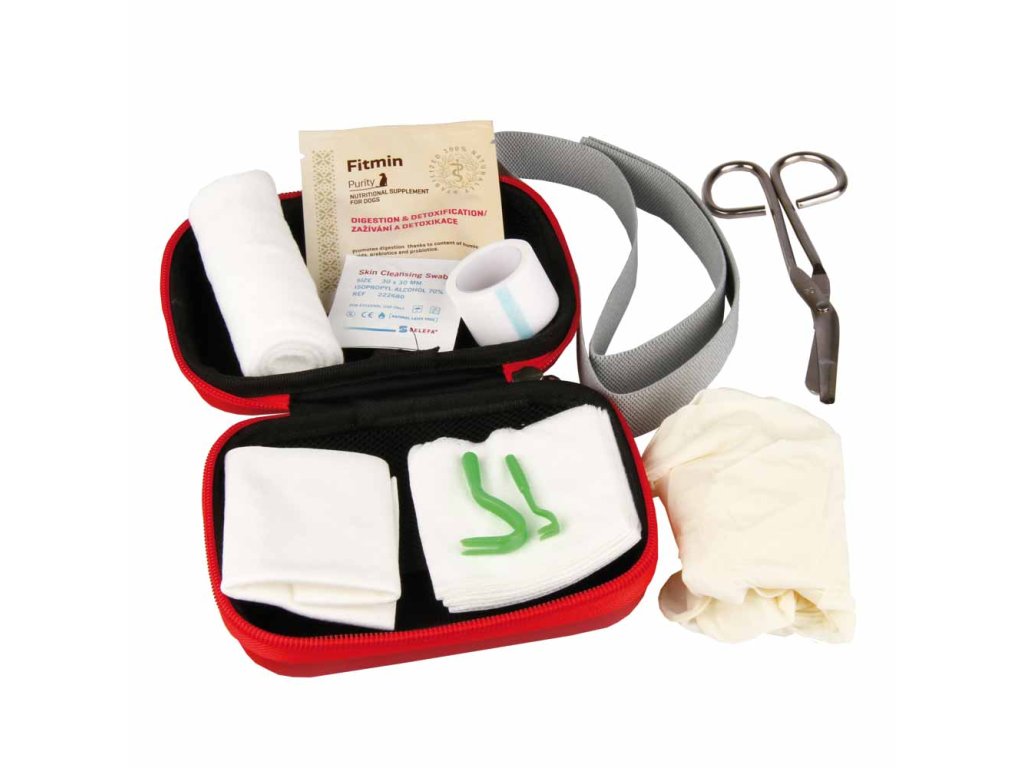 Често ли пътувате и се страхувате, че нещо ще се случи с любимеца ви? Комплектът за първа помощ Fitmin е точно за вас – практичен за пътуване поради малкия си размер. Комплектът съдържа всички необходими неща, които ще ви трябват, когато кучето или котката ви се нарани: