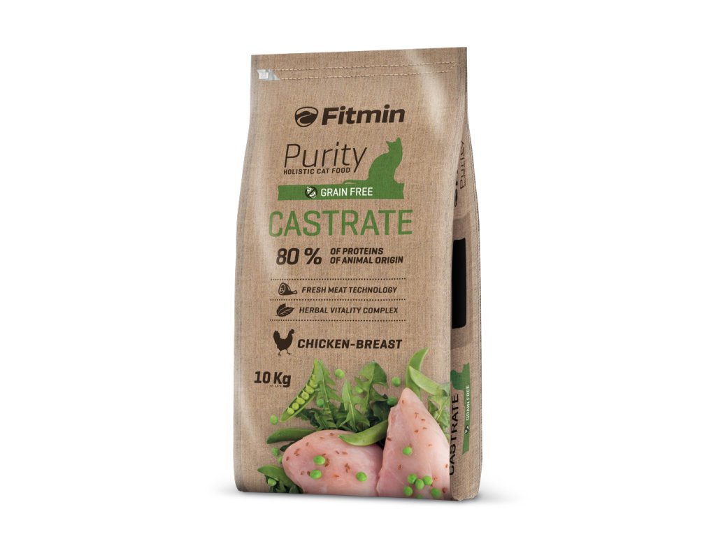 Кулинарно преживяване за вашата котка. Това е храната Fitmin cat Purity Castrate. Цялостна храна за котки с прясно пилешко месо, билки за поддържане на жизнеността, плодове и зеленчуци. Така не само ще задоволите апетита на котките си, но и ще им осигурите първокласно качество. Fitmin cat Purity Castrate е беззърнеста храна за котки, което означава, че не съдържа зърнени култури, не съдържа глутен и намалява потенциалния риск от алергични реакции (например към пшеничен и царевичен глутен). Уникалната формула е идеална за кастрирани котки. Благодарение на нея котката ще бъде в отлично състояние и не на последно място храната има важна детоксикираща функция благодарение на билковата смес, която има много други полезни ефекти. Гранулите за котки Fitmin cat Purity Castrate се произвеждат по най-новите технологии, балансирани са, съдържат висок дял животински съставки и много други ползи - особено комплекс за стоматологична грижа, пребиотици, хелати и др.