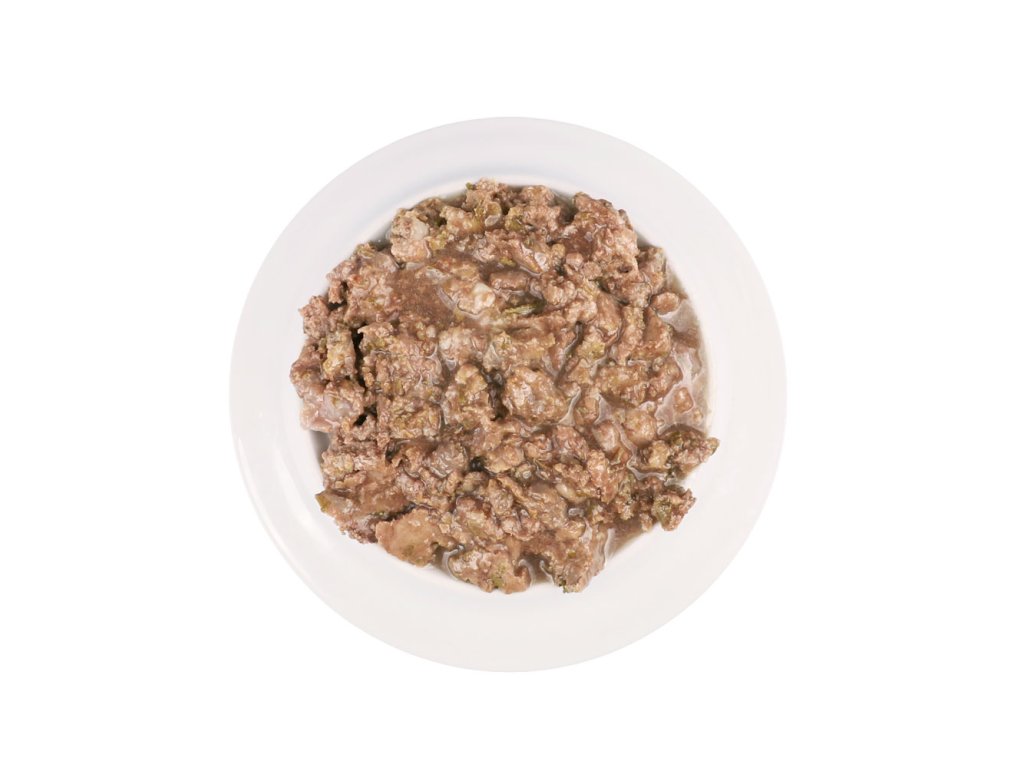 Говеждо месо 60%, говежди сърца 25%, говежди бульон 11%, коприва 2%, минерали, пребиотици (FOS, MOS) 1%.