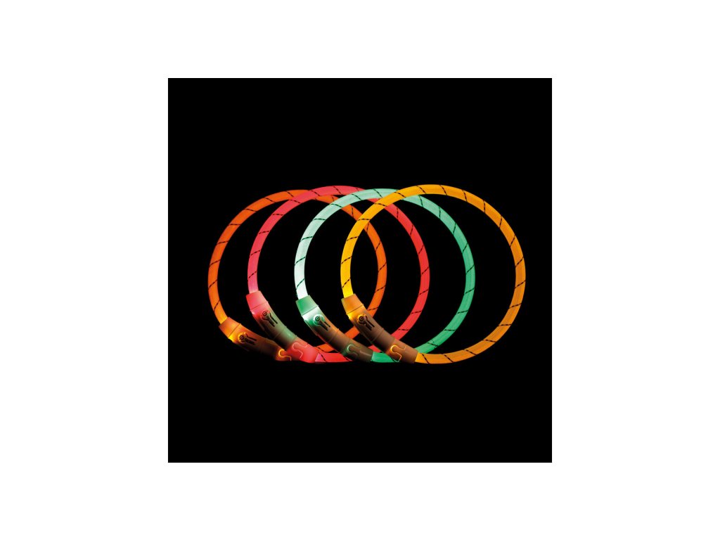 Светещ оранжев нашийник с USB зареждане. Светещ аксесоар, който се носи заедно с обикновения нашийник на вашето куче. Нашийникът издържа приблизително 5 часа при режим на мигаща светлина и около 3 часа при постоянно светене. Изключително практичен е при нощни разходки или в ситуации, когато трябва бързо да намерите своя любимец. Светлината е достатъчно ярка, но не толкова силна, че да дразни кучето.