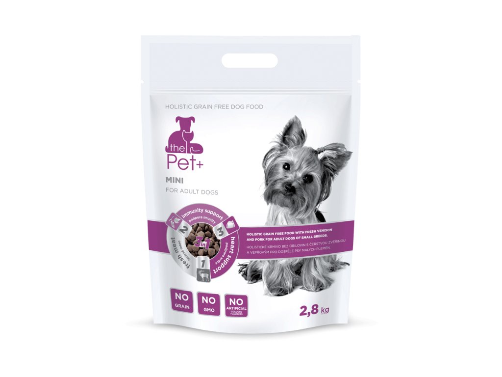 Пълноценна храна за възрастни кучета от дребни породи с прясно дивечово и свинско месо, която не съдържа зърнени култури. ThePet+ Mini за дребни кучета съдържа прясно дивечово месо, което е питателно и лесносмилаемо, богато на белтъчини и витамини. Съдържащият се в храната касис подпомага имунитета и заедно с други витамини поддържа защитните сили на организма.
